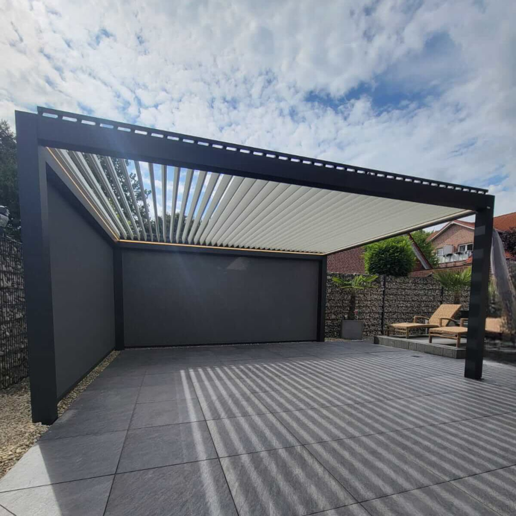 Dank verstellbarer Lamellen passt sich diese intelligente Überdachung flexibel an Wetter, Tageszeit und persönliche Vorlieben an. Ob offene Belüftung bei Sommerhitze oder geschlossener Schutz bei Regen – Sie entscheiden, wie Ihr Außenraum sich anfühlen soll.